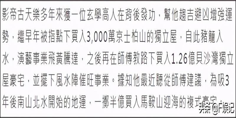港媒爆料古天乐一直都笃信玄学风水称他背后一直都有玄学高手帮忙指点一二从早前花3000万港元购入独立屋让其事业平步青云然后再花126亿港元再次买入豪宅并且在里面摆风水阵港媒更透露最近古天乐再次听从背后高人的建议花半亿港元买入马鞍山迎海的复式豪宅据悉是为了未来的财运着想
