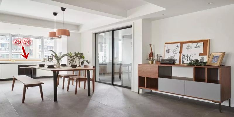 注意阳台和厨房之间的门一定要选择玻璃门不能影响厨房的采光和通风阳台和餐厅之间则省了安装门的麻烦事毕竟西厨没有油烟的困扰当然了如果你想安装也是可以同样首选玻璃门