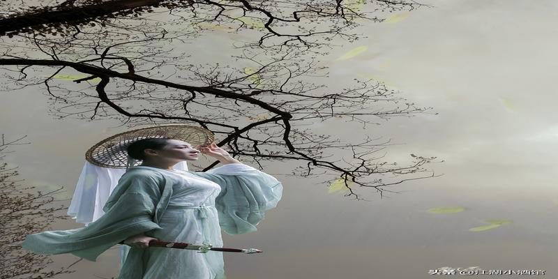 忽听短笛横吹烟波浩淼之中驶来一艘乌篷小船船头站立一名红衣女子风吹红衣起浪映衬的女子如凌波仙子